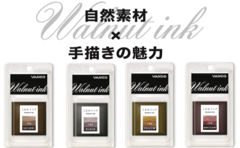 木のみが紡ぐ優しい色の表現を可能にする くるみインク クラフト思考のニーズに応える、粉末つけペン専用インク。くるみの殻から抽出された天然由来のくるみインクは、濃厚で落ち着いた風合いのナチュラルな色彩が特徴。